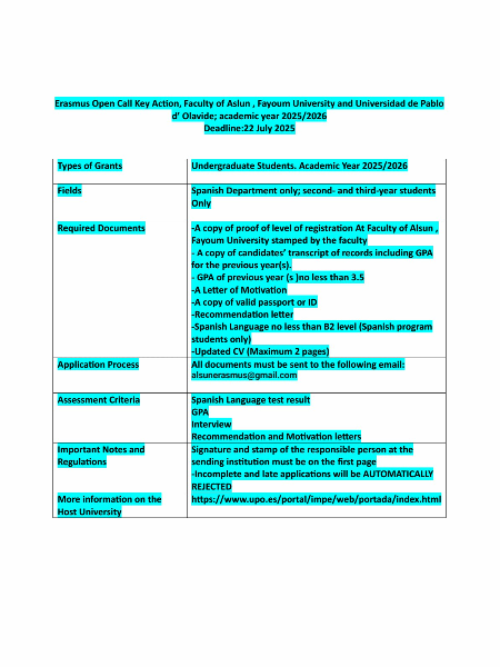 تم فنح باب التقديم لمنحة بابلو اولابيدى - إسبانيا - لطلاب الفرق الثانية والثالثة فقط قسم اللغة الاسبانية و مرفق شروط المنحة.