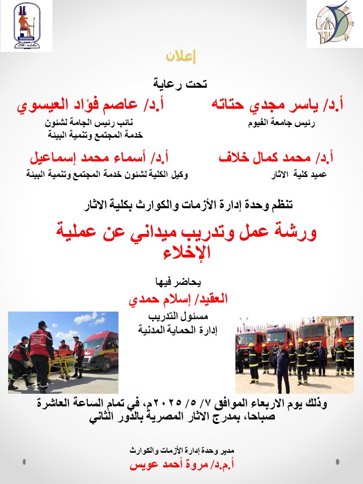 The Crisis and Disaster Management Unit organized a workshop and field training on evacuation procedures, delivered by Lt. Colonel Islam Hamdy, Civil Protection Training Officer, on Wednesday, 7 May 2025, at 10:00 a.m., in the Egyptian Antiquities Lecture Hall, 2nd Floor."