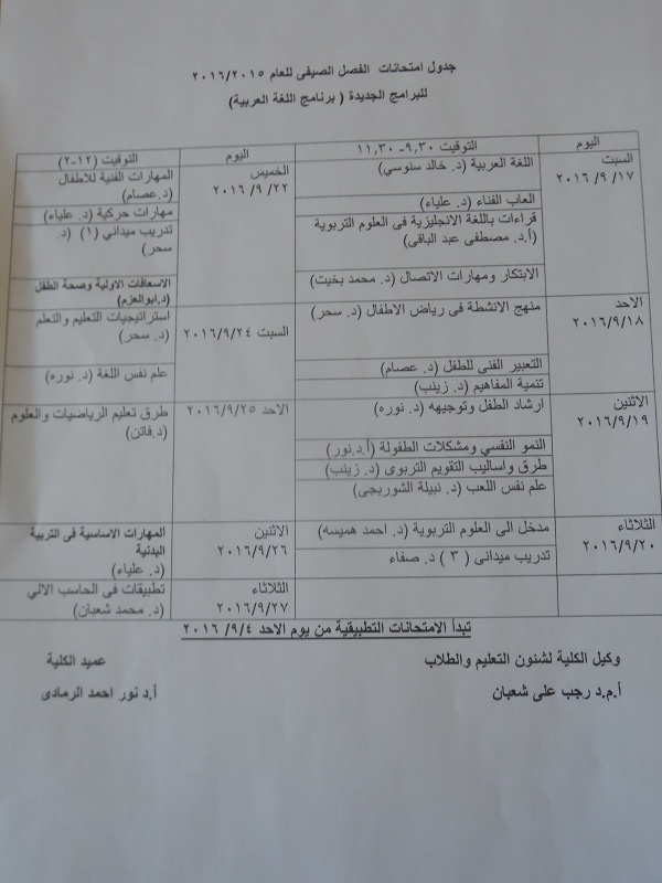 Summer semester exams schedule for the year 2015/2016 new programs( Arabic Program)