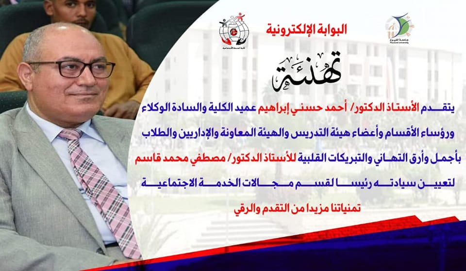 Prof. Ahmed Hosni Ibrahim, Dean of the Faculty, Vice Deans, Heads of Departments, Faculty Members, Supporting Staff, Administrators and Students extend their warmest congratulations to Prof. Mustafa Mohamed Qasem for his appointment as Head of the Department of Social Service Fields.