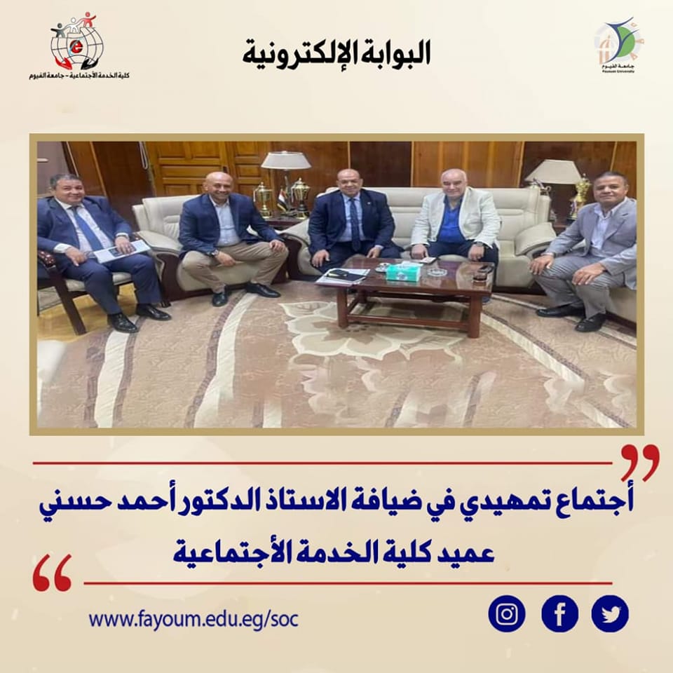 Prof. Ahmed Hosni, Dean of the Faculty of Social Work, hosted an introductory meeting, in the presence of a prof. Nasser Owais, Vice Dean for Postgraduate Studies and Research Affairs, Dr. Emad Abdel Salam, media advisor to the President of Fayoum University; and on behalf of the Regional Union in Fayoum, Mr. Mohsen Rabie, President of the Union, and Mr. Mohamed Ragab, Secretary of the NGOs.