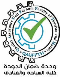 شرح الشعار : - تشير السواقي على الفيوم على وجود الكلية - تشير علامة (صح) إلى أهمية أن يكون الهدف المحدد صحيح من البداية ( فعالية) ويتم تنفيـذه بكفـاءة، وتنفيذه باللون الأخضر حتي يمثل الإستدامة - تشير الدائرة الداخلية التي بالداخل الا أن عملية الجودة مثل الدائرة لاتنهي فهي عملية مستمرة لا تتوقف فالجودة ليست حطة وصول بل رحلة - يشير شبه القلبين المتقابلين (الخلفية) إلى أهمية احتضان السائـــح والمحافظــة علـى خصوصيته وضمان أمنه.