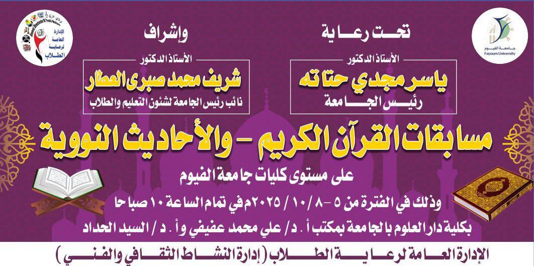 مسابقات القرآن الكريم والأحاديث النووية على مستوى كليات جامعة الفيوم في الفترة من 2025/10/8:5 في تمام الساعة 10 صباحًا بكلية دار العلوم بالجامعة بمكتب أ.د/ على محمد عفيفي و أ.د/السيد الحداد