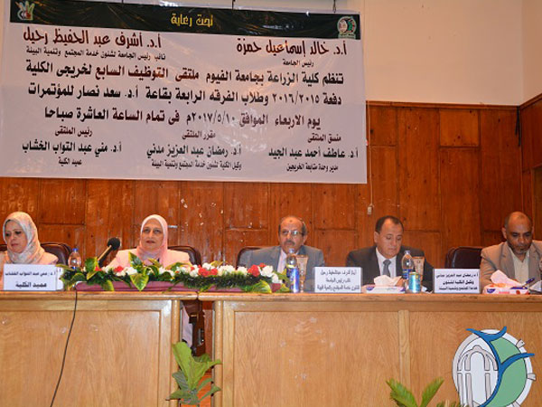 تحت رعاية الاستاذ الدكتور/ خالد اسماعيل حمزة رئيس جامعة الفيوم ، شهد الاستاذ الدكتور/ أشرف عبد الحفيظ نائب رئيس الجامعة لشئون خدمة المجتمع وتنمية البيئة فعاليات الملتقى التوظيفي السابع الذي تنظمه كلية الزراعة لخريجي دفعة 2015/2016 وطلاب الفرقة الرابعة ، بحضور الاستاذ الدكتور/ منى الخشاب عميد الكلية ، الاستاذ الدكتور/ رمضان مدني وكيل الكلية لشئون خدمة المجتمع وتنمية البيئة والاستاذ الدكتور/ نفين السواح وكيل الكلية لشئون الدراسات العليا والبحوث، الاستاذ الدكتور/ عاطف أحمد مدير وحدة متابعة الخريجين ، الاستاذ الدكتور/ وليد الشيمي مدير مركز متابعة الخريجين بالجامعة ، وعددا من اعضاء هيئة التدريس وممثلي مؤسسات سوق العمل المختلفة وطلاب وخريجي الكلية ، وذلك يوم الاربعاء الموافق 2017/5/10 بقاعة الاستاذ الدكتور سعد نصار بالجامعة .
