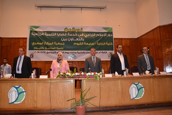 تحت رعاية الأستاذ الدكتور / خالد اسماعيل حمزة رئيس جامعة الفيوم والأستاذ الدكتور / أشرف عبد الحفيظ رحيل نائب رئيس الجامعة لشئون خدمة المجتمع وتنمية البيئة ، واشراف الأستاذة الدكتورة / منى الخشاب عميد كلية الزراعة حيث شهدت سيادتها فعاليات ندوة تحت عنوان " دور الاعلام الزراعي في خدمة قضايا التنمية الزراعية " والتي نظمتها كلية الزراعة بالتعاون مع جمعية المزارع المصري لتنمية المجتمع بالفيوم صباح اليوم الثلاثاء الموافق 14/11/2017 بقاعة الاستاذ الدكتور سعد نصار بالجامعة بحضور الأستاذ الدكتور / فاروق جاد الله وكيل الكلية لشئون خدمة المجتمع وتنمية البيئة والدكتور / أيمن شيلابي أستاذ مساعد بقسم الاقتصادي الزراعي بالكلية والمهندس / ماهر أبو جبل رئيس لجنة التطوير وحماية المهنة بنقابة الزراعيين ومقرر لجنة الاعلام والدكتور / هادى حسان كبير المذيعين بإذاعة شمال الصعيد والأستاذ / عادل اللواج رئيس مجلس ادارة جمعية المزارع المصري وعدداً من أعضاء هيئة التدريس وممثلي الشركات والجمعيات الزراعية والمزارعين والطلاب .