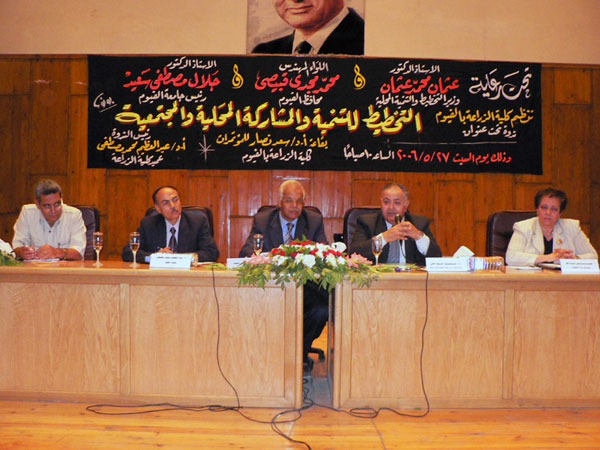 عقدت ندوة فى يوم 27 مايو 2006 بعنوان التخطيط للتنمية والمشاركة المجتمعة والمحلية بقاعة أ. د. سعد نصار للمؤتمرات بالكلية وقد أدار الندوة كل من : أ. د. عبد العظيم محمد مصطفى (عميد كلية الزراعة ) بجامعة الفيوم .