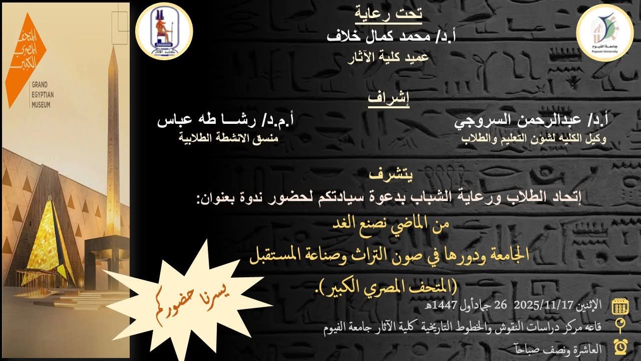 يتشرف إتحاد الطلاب ورعاية الشباب بدعوة سيادتكم لحضور ندوة بعنوان( من الماضي نصنع المستقبل) الجامعة ودورها في صون التراث وصناعة المستقبل