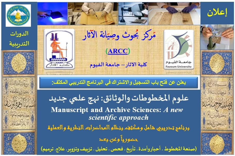 يُعلن مَركز بُحوث وصِيانة الآثار (ARCC) بكلية الآثار جامعة الفيوم ضمن دوراته وبرامجه التدريبية عن فتح باب التسجيل والاشتراك في البرنامج التدريبي المكثف:
