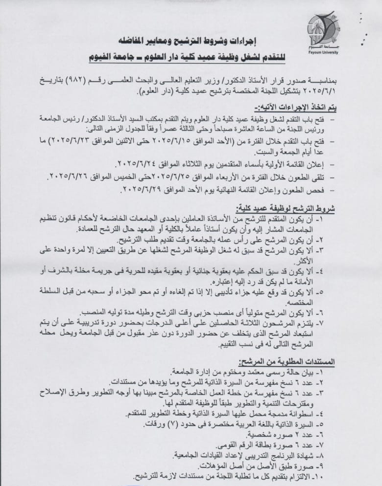 مرفق صورة من إجراءات وشروط الترشيح ومعايير المفاضلة للتقدم لشغل وظيفة عميد كلية دار العلوم - جامعة الفيوم.