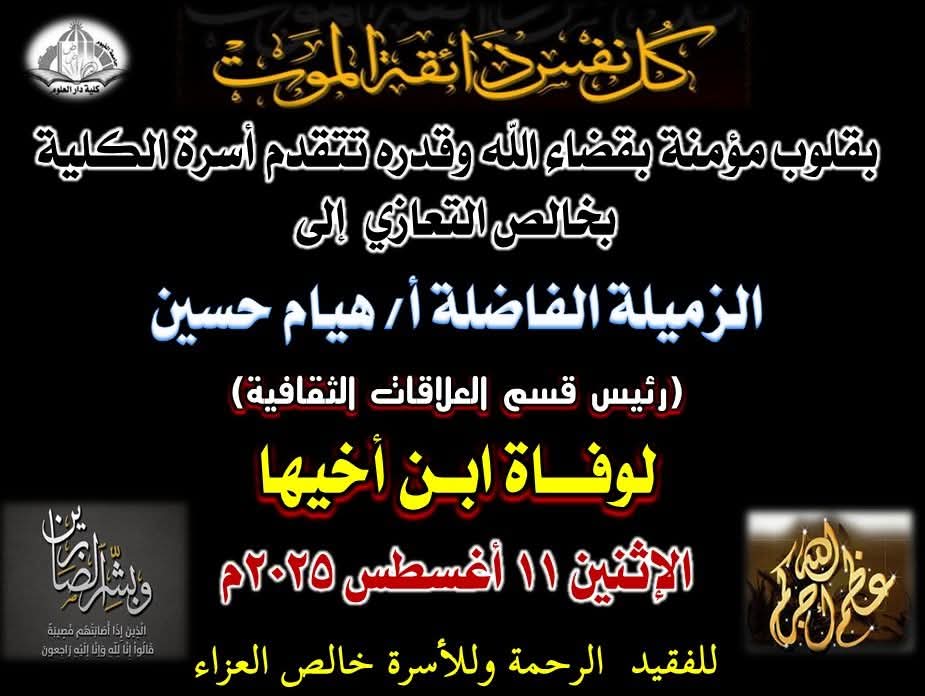 تتقدم أسرة كلية دار العلوم بخالص العزاء والمواساة إلى أ/ هيام حسين -رئيس قسم العلاقات الثقافية بالكلية- في وفاة ابن أخيها رحمة الله عليه، والذي انتقل إلى رحمة الله تعالى اليوم الاثنين الموافق ١١-٨-٢٠٢٥ م.
