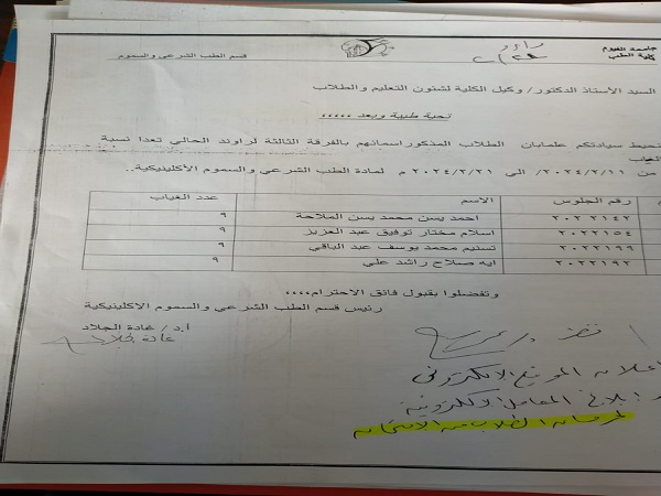 | A warning notice of exceeding the permissible percentage of absence and the possibility of being deprived of taking exams for some third-year students in the forensic medicine department. |