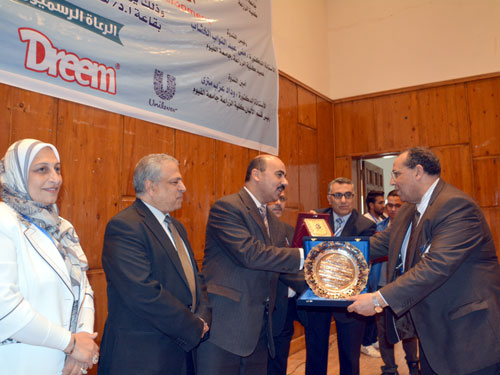 At the end of the seminar, Prof. Khaled Ismail Hamza presented the University Shield to Prof. Mohamed Mahmoud Yousef, the spokesman on behalf of the Board of Directors of the Scientific Association for Food Industries.