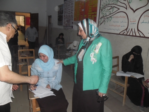 Pro.Dr.Mona Al Kashap, Dean of the college of agriculture,checks the examsof the second semester at the college with Pro.Dr.Kaled Ata Allah agent of the college for students and education affairs.