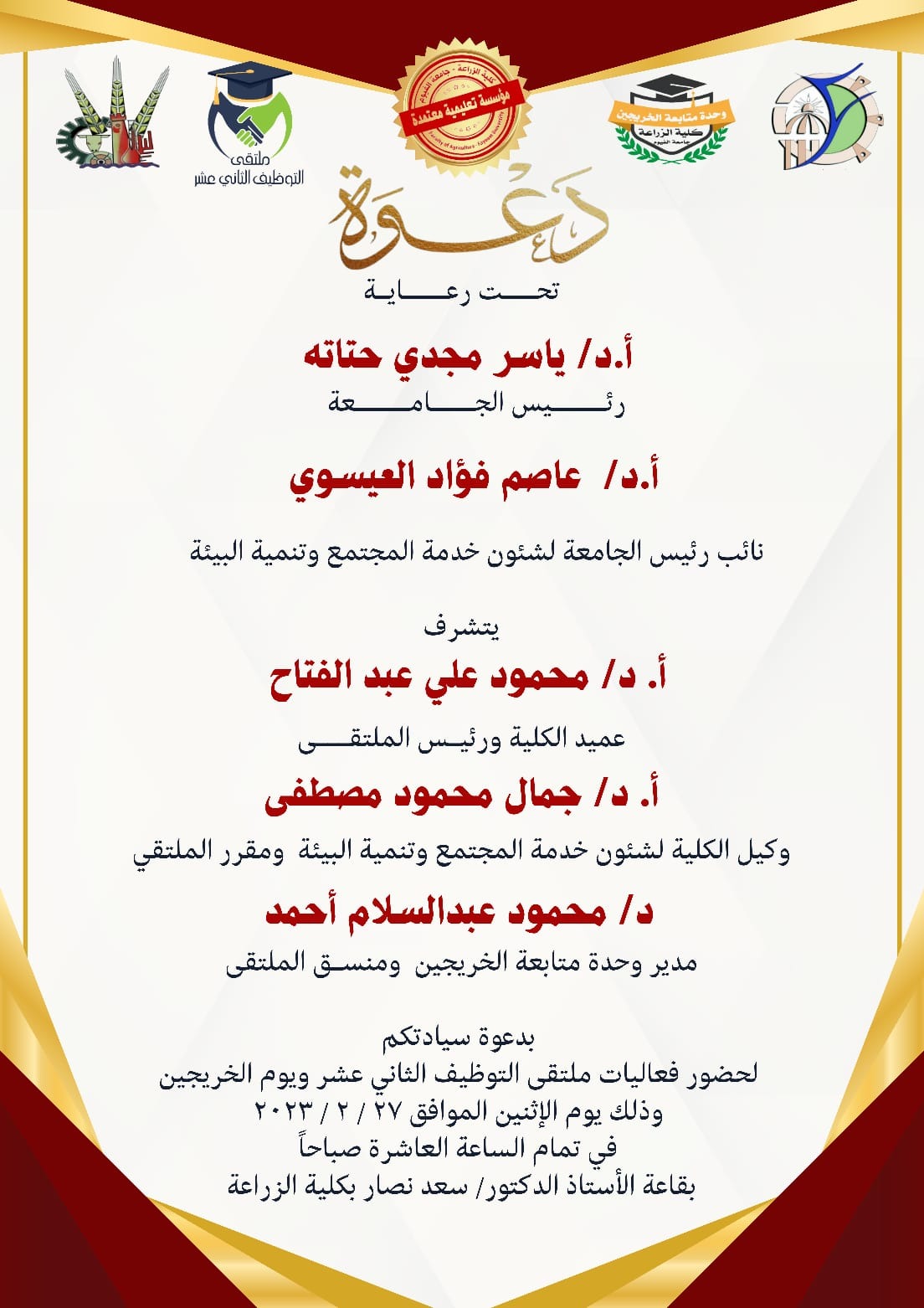 Prof. Mahmoud Ali Abdelfattah, Dean of the Faculty of Agriculture and President of the Employment Forum, Prof. Gamal Mahmoud Mostafa, Vice Dean for Community Service and the forum rapporteur & Dr. Mahmoud AbdEl Salam the coordinator of the forum and manager of the graduate unit have the honor to invite you to attend the 12th Employment Forum and the day of Graduates On Monday 27th February 2023 at 10 AM, In the conference hall of Prof. Saad Nassaar in the Faculty of Agriculture, Fayoum University, Egypt.