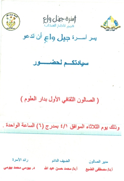 On Tuesday 1/4/2014, Gail Wa'ee Student Organization held its first cultural salon. The event was attended by Prof. Mostafa Al-Dabea, vice dean for Community Service and Environment Development, and Prof. Mohamed Hassan Abdullah, forum guest.