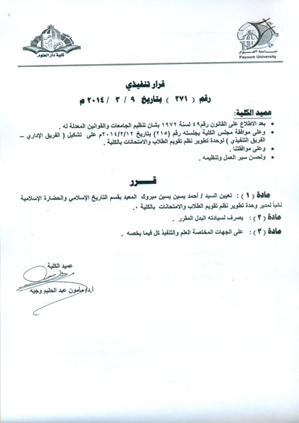 The Faculty of Dar Al Uloom announces that the Development of Students' Assessment Development Systems Unit (DSASU) has appointed Mr. Ahmed Yasin, a demonstrator at the Department of Islamic History and Civilization, as deputy director.