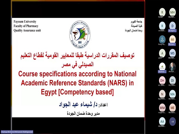 The Quality Assurance Unit organized a workshop on Saturday, October 12, 2024, titled “Course Description According to the National Academic Reference Standards (NARS) for Pharmaceutical Education,” for faculty members and teaching assistants, held online via Microsoft Teams.