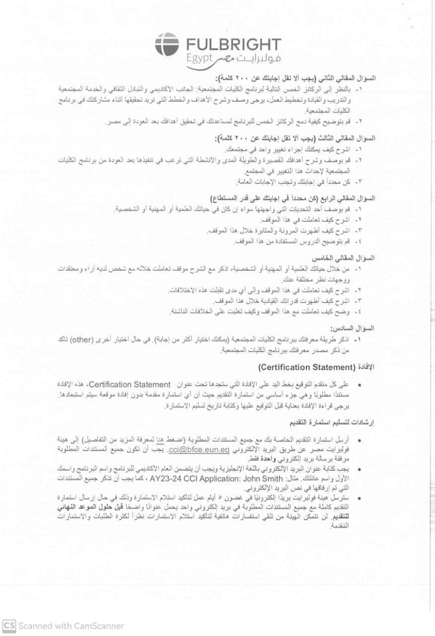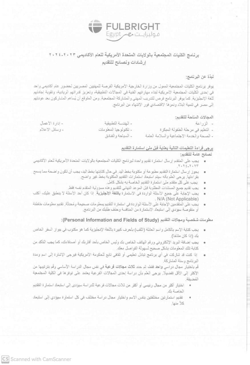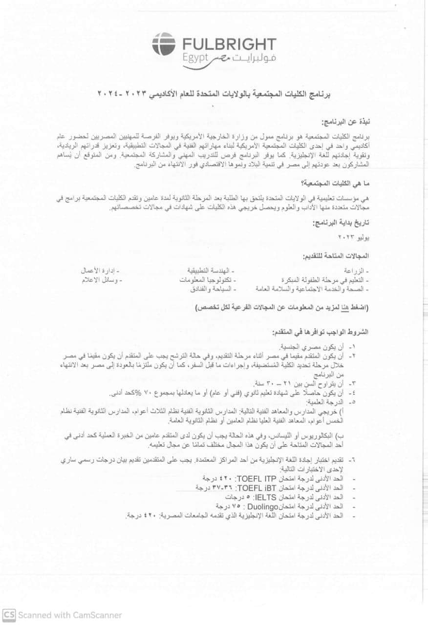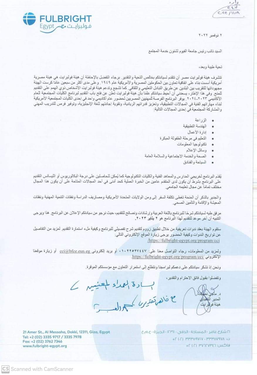 Within the framework of the cooperation of Egyptian universities with international bodies and organizations to develop the skills of their graduates and refine their experiences to keep pace with the rapid development in the labor market, the Community Facultys Program in the United States of America for the academic year 2023-2024 AD, in cooperation with the Fulbright Egypt Organization (an American international organization) is attached so that the graduates of your Esteemed Faculty develop their skills and refine work experiences.