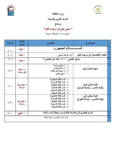 Dans le cadre de l'initiative « Fils de Rifa'a » du Centre National de Traduction, qui vise à célébrer les grands traducteurs qui ont enrichi la vie culturelle et intellectuelle de notre patrie, l'Egypte, et du monde arabe, le Centre National de Traduction, dirigé du Dr. Karma Sami, organise la célébration « L'art de traduire la pensée » à l'occasion du 120e anniversaire de la naissance de l'éminent écrivain et intellectuel Yahya Haqqi, et célèbre les étudiants des facultés des Lettres de Helwan et Al-. Alsun du Fayoum, pour avoir complété le programme de traduction Yahya Haqqi en coopération entre le centre et leurs universités.