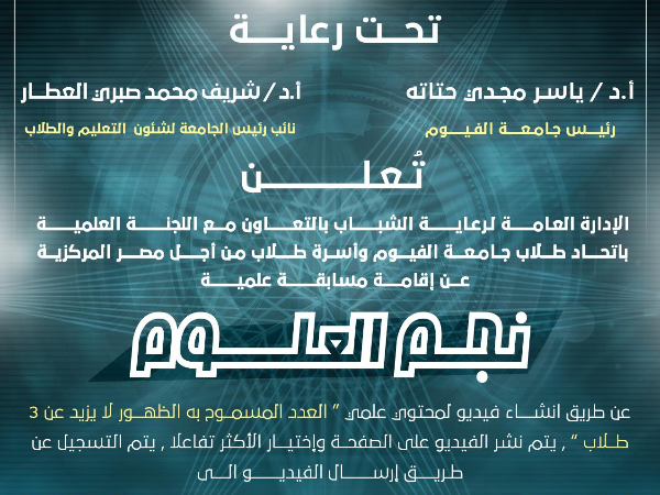 L'Administration générale de la protection des jeunes, en coopération avec le Comité scientifique de l'Union des étudiants de l'Université du Fayoum et la Famille des étudiants du Centre de l'Egypte, annonce la tenue d'un concours scientifique.