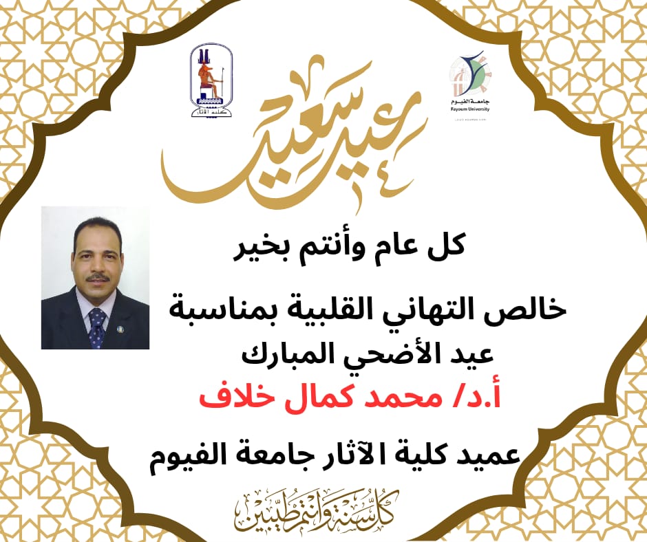 Le prof.Dr. Mohamed Kamal Khallaf, doyen de la faculté, adresse ses sincères félicitations aux doyens, aux chefs de département, aux enseignants, au personnel de soutien, aux administrateurs, aux étudiants et à tous les membres de la faculté d'archéologie de l'université du Fayoum, à l'occasion de l'Aïd al-Adha. Que Dieu nous accorde à tous sa bonté, ses bénédictions et sa prospérité.