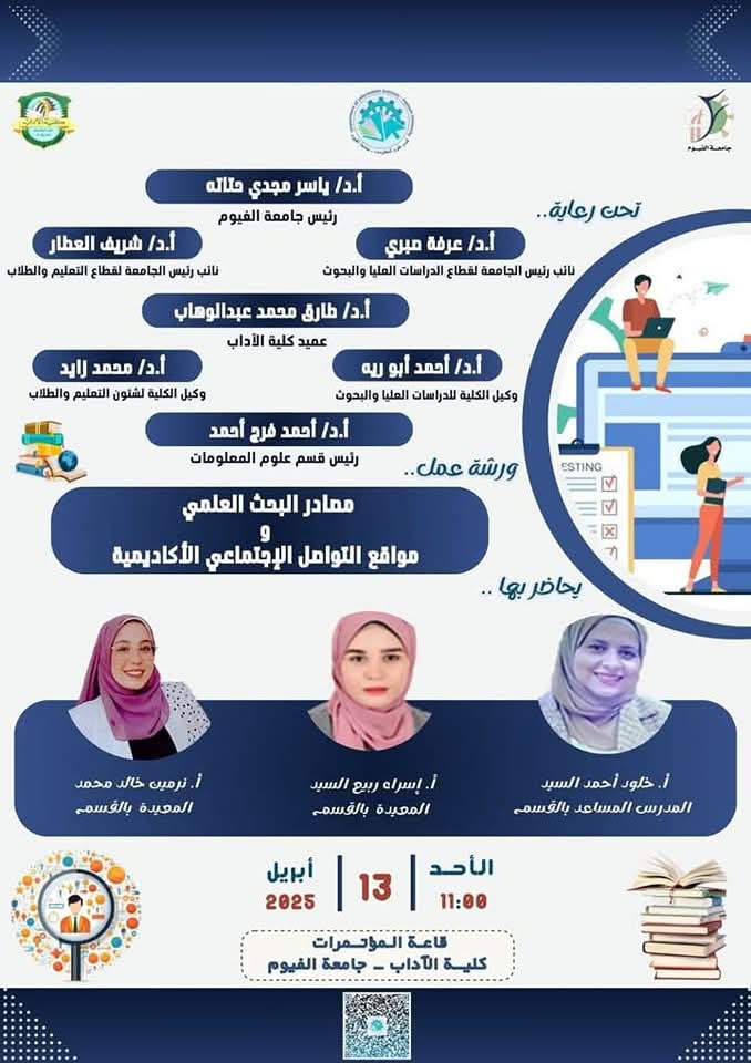 Le Département des sciences de l'information, Faculté des lettres, Université du Fayoum, dirigé par le prof. Dr. Ahmed Farag Ahmed, organise un atelier intitulé : (Sources de recherche scientifique et sites de médias sociaux universitaires)