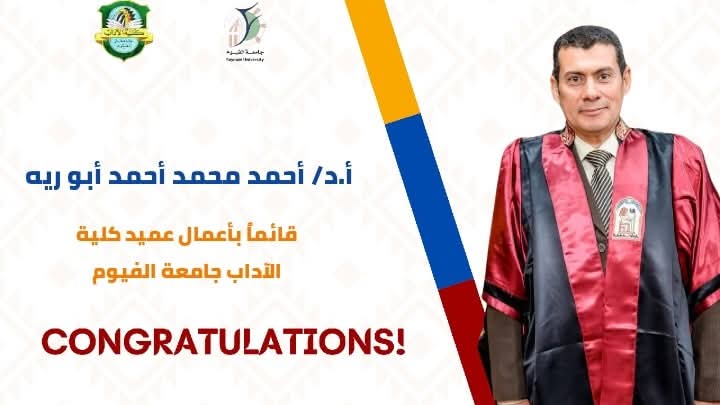 La Faculté des Lettres de l'Université du Fayoum, avec l'ensemble de ses membres, y compris les estimés vice-doyens, les éminents membres du corps professoral, le personnel adjoint distingué, ainsi que l'ensemble du personnel administratif et administratif, est honorée d'adresser ses plus chaleureuses félicitations et ses meilleurs vœux au Prof. Ahmed Mohamed Ahmed Abu Rayya, estimé Vice-doyen aux Etudes Supérieures et à la Recherche.