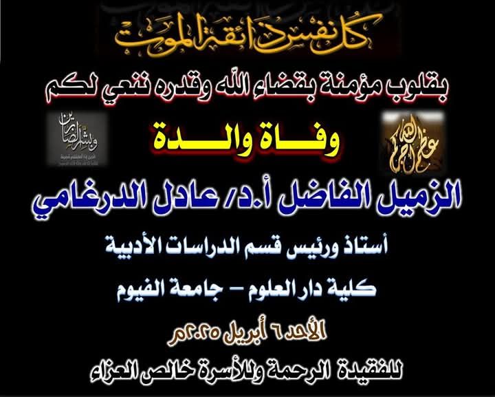 Avec des cœurs qui croient et sont satisfaits de la volonté de Dieu, la famille du Collège Dar Al-Ulum présente ses sincères condoléances et sa sympathie à Son Excellence le Prof.Dr. Adel Daragham - professeur et chef du département d'études littéraires - à l'occasion du décès de son honorable mère, décédée à la miséricorde de Dieu Tout-Puissant le dimanche 6 avril 2025 après JC.