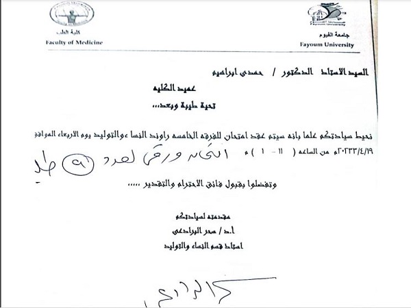 Annonce à la cinquième année concernant l’examen d’obstétrique et de gynécologie.
