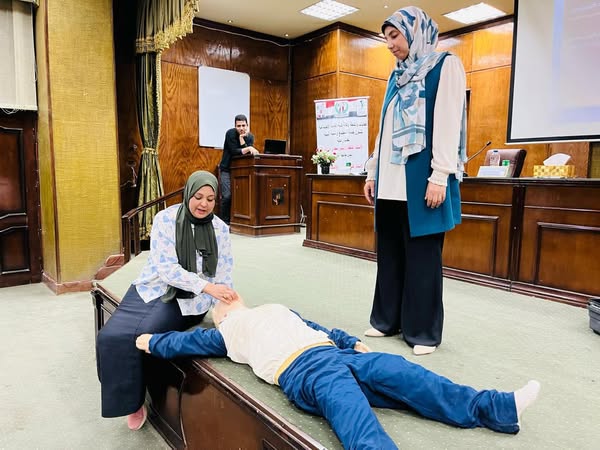 Le Dr Hasnaa Hamdi a expliqué la méthode d’examen initiale du patient, qui consiste en trois points importants : (la conscience du patient, la mesure du pouls du patient et la respiration du patient).