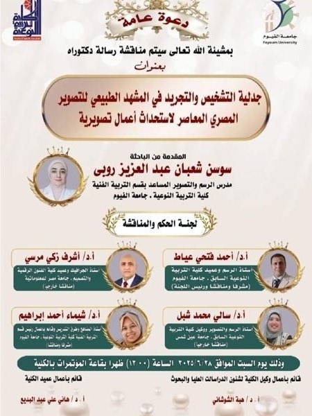 La thèse de doctorat de la chercheuse / Susan Shaaban Abdel Aziz Ruby, maître de conférences adjointe en dessin et peinture au département d'éducation artistique du Collège, sera discutée le samedi 28/06/2025 à 12h00 dans la salle de conférence du Collège.
