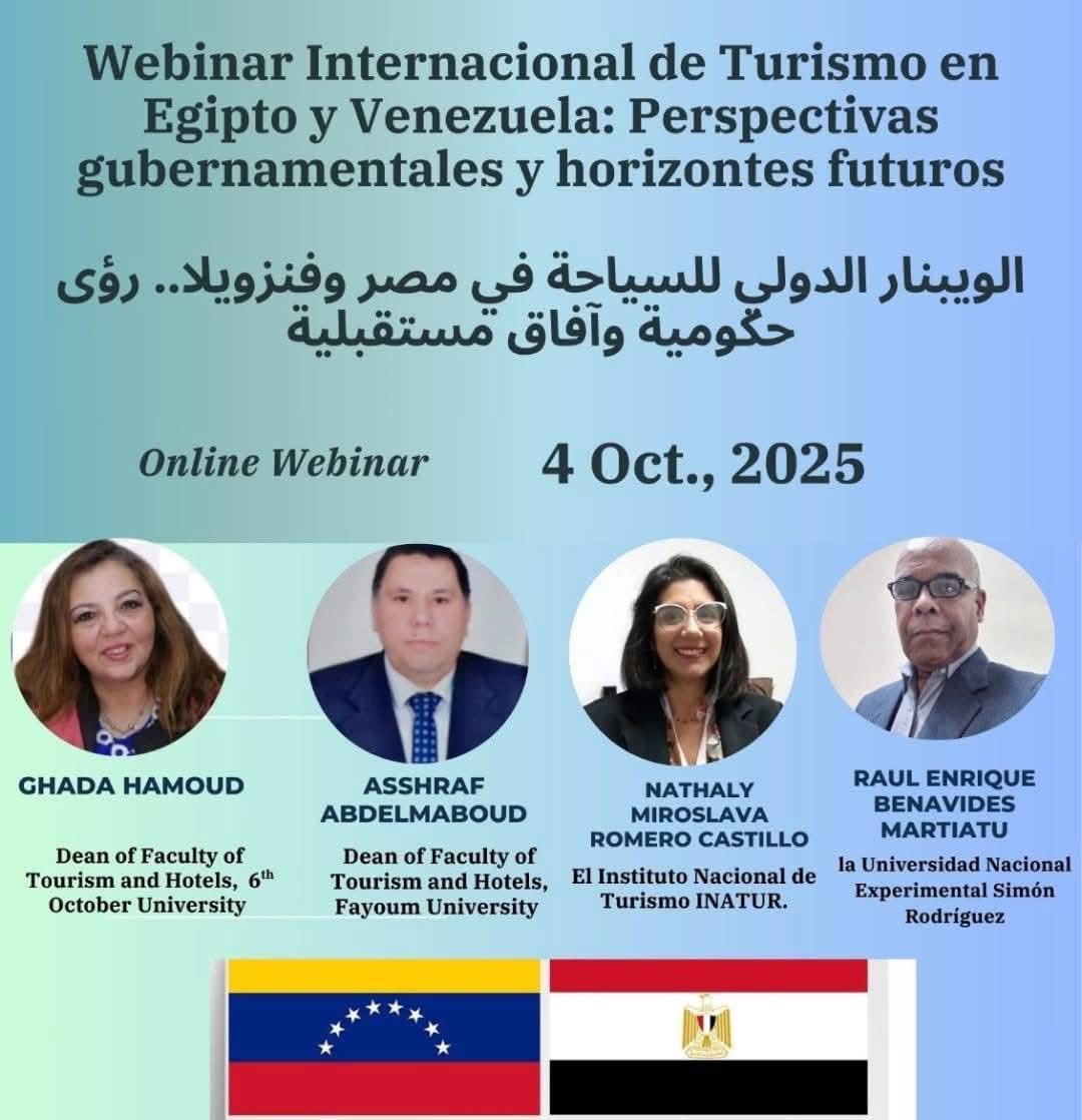 Ce webinaire s'inscrit dans le cadre des célébrations stratégiques de la Journée mondiale du tourisme et commémore, avec une grande importance, 75 ans de relations diplomatiques fructueuses entre le Venezuela et l'Egypte. Il témoigne de l'engagement indéfectible de notre mission diplomatique à renforcer les liens bilatéraux et à soutenir activement la coopération touristique.