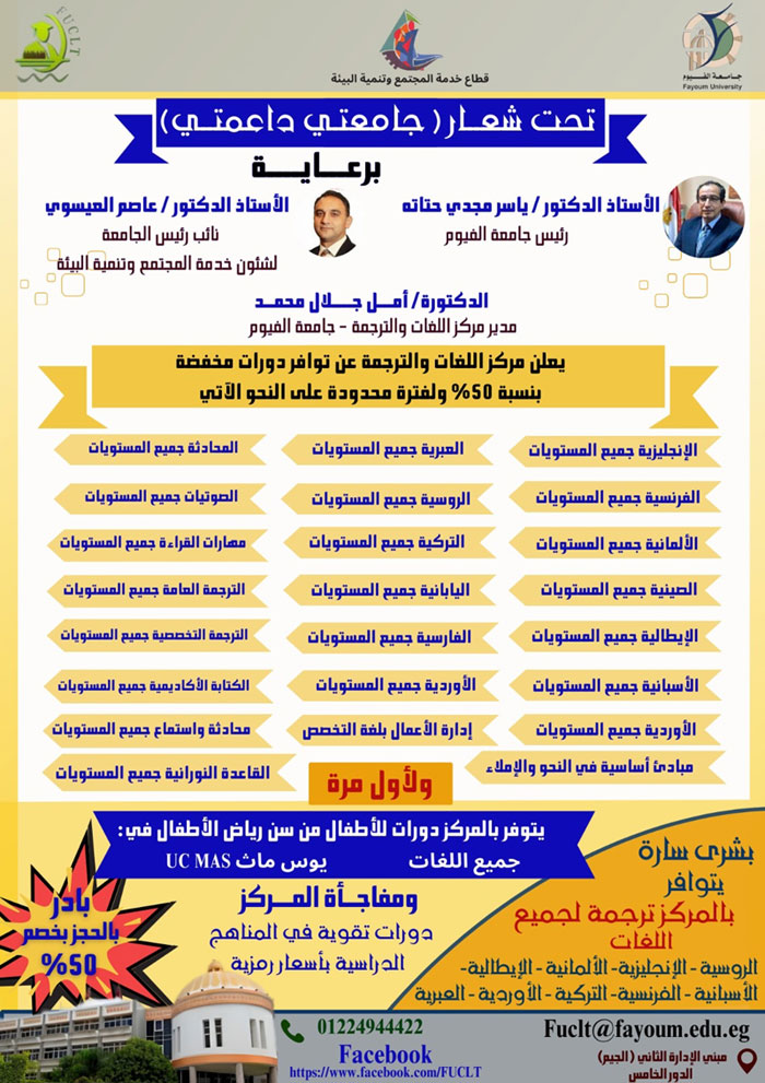 تحت رعاية الأستاذ الدكتور/ياسر مجدى حتاته رئيس الجامعة وإشراف الأستاذ الدكتور/عاصم فؤاد العيسوى نائب رئيس الجامعة لشئون خدمة المجتمع وتنمية البيئة يعلن مركز اللغات والترجمة عن توافر دورات مخفضة في كافة اللغات للحجز والاستعلام https://fuclt.fayoum.edu.eg تليفون: 01224944422  |