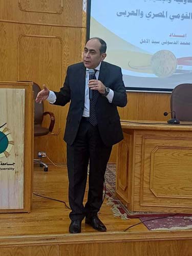 وأشار سيادته إلى قناة السويس واهميتها وموقعها الاستراتيجي وأزمات الدول المجاورة لمصر وسيناء عبر العصور التاريخية وبنى إسرائيل والآثار الدينية والقومية والتاريخية لشبه جزيرة سيناء ومراحل تاريخ إسرائيل من خلال ٤ مراحل هى العبرانية والاسرائيلية واليهوديه والصهيونية وتاريخ إسرائيل منذ دخول أرض كنعان حتى اليوم. وأكد سيادته على أن مصر تواجه عدد كبير من التحديات التي تهدد أمنها القومي بما فى ذلك التحديات والتهديدات العسكرية والاقتصادية والسياسية مؤكدًا على ضرورة أن يكون الجميع على قلب رجل واحد خلال هذه الفترة.