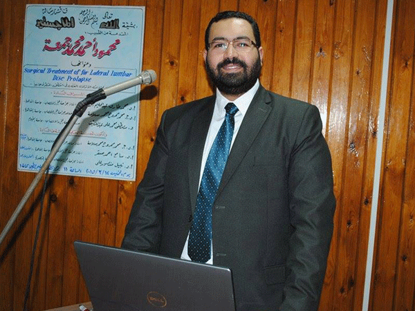 تهني إدارة المستشفيات الجامعية الدكتور/ محمود جمعة تخصص جراحة المخ والأعصاب وذلك لمناقشة سيادته رسالة الماجستير الخاصة به بعنوان "التدخل الجراحي لحالات الانزلاق الغضروفي القطني المتطرف جانبيا".
