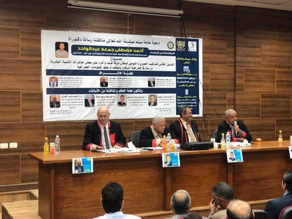 أ.د/ احمد حسن إبراهيم أستاذ الجغرافية البشرية المتفرغ وعميد كلية الآداب بجامعة القاهرة الأسبق رئيساً ومناقشاً وأ.د/ رفيق محمود عبدالواحد الدياسطي أستاذ الجغرافية البشرية ورئيس قسم الجغرافية ونظم المعلومات الجغرافية السابق بكلية الآداب جامعة حلوان، وأ.د/ حسن محمد إبراهيم حسونة استاذ الجغرافية البشرية المتفرغ وعميد المعهد السابق مشرفاً رئيساً وعضواً ، والدكتور أحمد فؤاد المغازي استاذ جغرافية السكان المساعد ووكيل المعهد لشئون خدمة المجتمع وتنمية البيئة مشرفاً وعضواً، وقد تمت مناقشة الباحث مناقشة علنية وفيها تم منح الباحث درجة دكتوراة الفلسفة في دراسات دول حوض النيل بتقدير مرتبة الشرف الأولى ، وكان ذلك بحضور السادة أعضاء هيئة التدريس بالمعهد وطلاب الدراسات العليا ولفيف من أهل وزملاء الباحث.