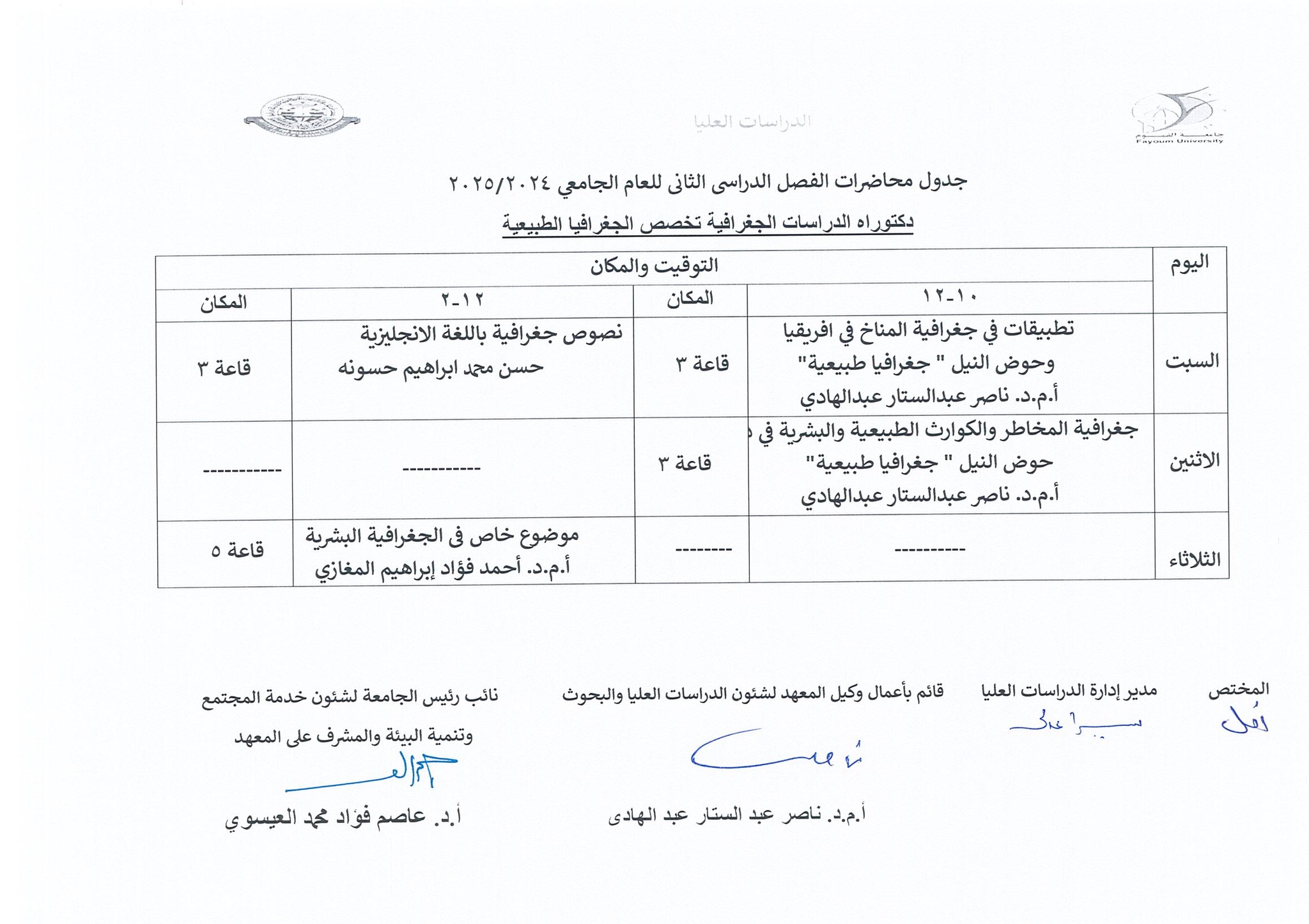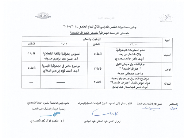 اعتمد معالي الأستاذ الدكتور/ عاصم العيسوي نائب رئيس الجامعة لشئون خدمة المجتمع وتنمية البيئة و المشرف على المعهد جداول المحاضرات لبرامج الدراسات العليا في المعهد (دبلوم -ماجستير-دكتوراه) للفصل الدراسي الثاني للعام الجامعي 2024/ 2025 مع أطيب التمنيات بالتوفيق.