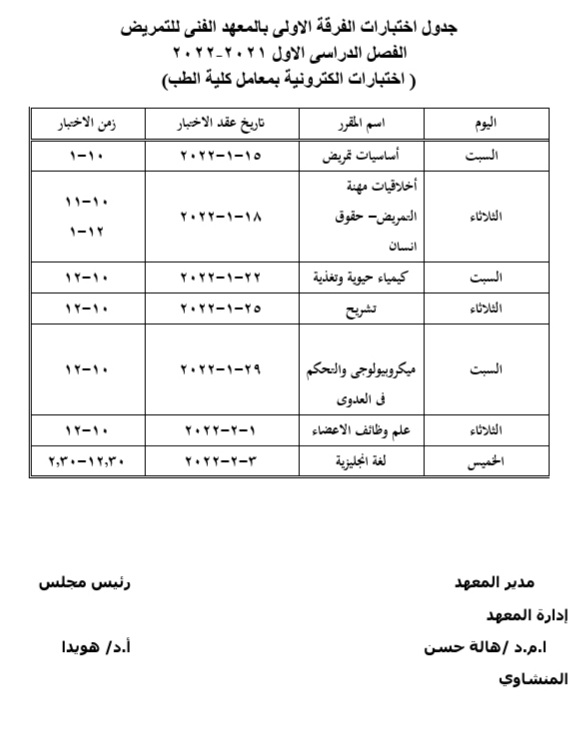 جدول الاختبارات الإلكترونية للفرقة الأولي بالمعهد الفني للتمريض