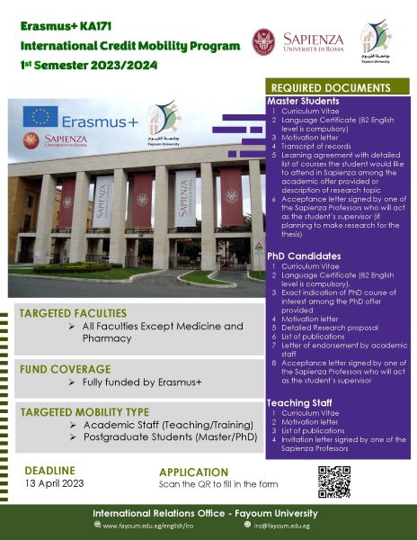 يعلن مكتب العلاقات الدولية بجامعة الفيوم عن تقديم جامعة سابينزا روما الإيطالية عدد من المنح ضمن برنامج Erasmus+ International Credit Mobility Program (KA171)