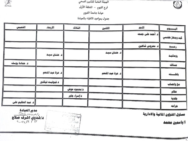 تعلن الهيئة العامة للتأمين الصحى فرع الفيوم – المنطقة الأولى عيادة جامعة الفيوم عن جدول مواعيد الأطباء بعيادة التأمين الصحى بجامعة الفيوم