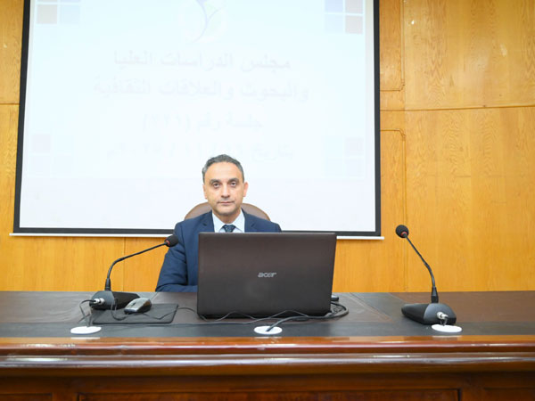 تحتَ رعايةِ الأستاذِ الدُّكتور / ياسر مجدي حتاتة، رئيسِ جامعةِ الفيّوم، انعقدَ مجلسُ شؤونِ الدِّراساتِ العُليا والبحوثِ والعلاقاتِ الثقافيَّة في جلستِه رقم (221)، برئاسةِ الأستاذِ الدُّكتور / عاصم فؤاد العيسوي، نائبِ رئيسِ الجامعةِ لشؤونِ خدمةِ المجتمعِ وتنميةِ البيئة، والمشرِفِ على قطاعِ الدِّراساتِ العُليا والبحوث، وبحضورِ السّادةِ أعضاءِ المجلسِ الـمُوقَّر، وذلك اليومَ الأحد الموافق 16 نوفمبر 2025م، بقاعةِ المؤتمراتِ بالمكتبةِ المركزيّة.