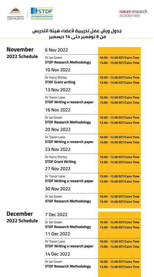 لأعضاء هيئة التدريس ومعاونيهم، يقدم بنك المعرفة المصري بالتعاون مع هيئة تمويل العلوم والتكنولوجيا والابتكار STDF وأكاديميات نيتشر البحثية التابعة للناشر Springer Nature ورش عمل تدريبية لمساعدة الباحثين المصريين على كتابة مقترحات مشروعات بحثية ونشر نتائجهم البحثية بمجلات علمية متميزة وتعزيز مهاراتهم البحثية.