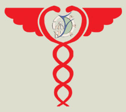 حيتان مجنحتان تلتف أحدهما مع الأخرى من جهة الذيل والرأسان متقابلتان على شكل قلب ويحتوي داخله على شعار جامعة الفيوم والحية المجنحة ترمز لكل ما هو طبي أو تمريضي أو علاجي واللون الأحمر لون الدم وهو سر الحياة.