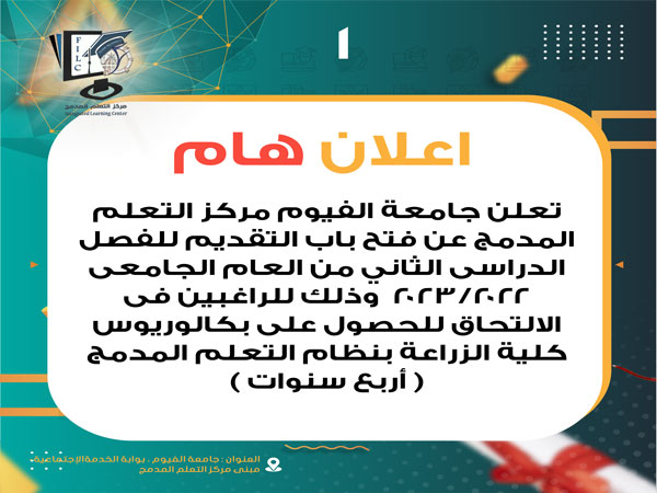 يعلن مركز التعلم المدمج عن استمرار فتح باب التقديم للفصل الدراسى الثاني من العام الجامعى 2022/2023 - للراغبين فى الالتحاق للحصول على بكالوريوس كلية الزراعة بنظام التعلم المدمج ( أربع سنوات )