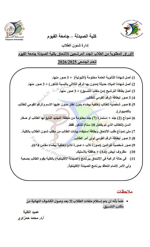 تعلن كلية الصيدلة جامعة الفيوم عن الأوراق المطلوبة لاستكمال إجراءات القيد والتسجيل للطلاب الجدد للعام الجامعي 2026/2025 تنويه هام سيتم الإعلان عن موعد التقديم واستلام الأوراق فور وصول الكشوف الرسمية من مكتب التنسيق، وذلك بعد إعلان نتيجة مرحلة تقليل الاغتراب مع تمنياتنا لجميع أبنائنا الطلاب بعام جامعي موفق