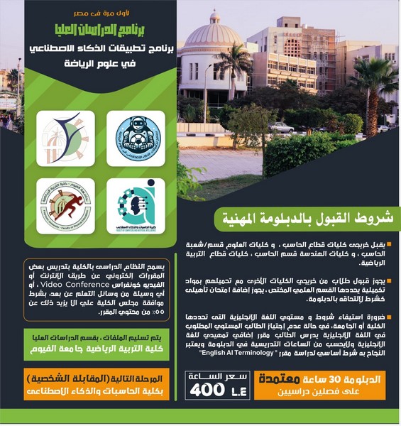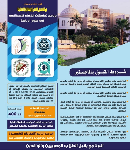 تم فتح باب القبول ببرنامج الدراسات العليا (دبلوم مهني / ماجستير مهني) ببرنامج تطبيقات الذكاء الإصطناعي في علوم الرياضة.