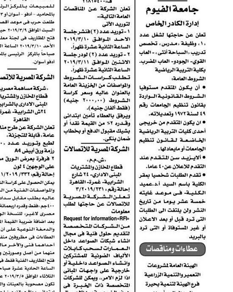 تعلن جامعة الفيوم (إدارة الكادر الخاص) عن حاجتها لشغل عدد (۱) وظيفة مدرس تخصص تدريب (السباحة أنثى - ألعاب قوى - الجودو - ألعاب المضرب) بكلية التربية الرياضية.
