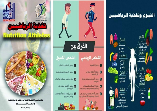قام طلاب الفرقة الرابعة بكلية التربية النوعية قسم الاقتصاد المنزلي (تغذية) بعمل مشروع تخرجهم بعنوان تقييم الحالة الغذائية لطلاب كلية التربية الرياضية (۲۰:۱۸سنة) ونشر الوعي الغذائي الثقافي لدى هذه الفئة بمحافظة الفيوم .