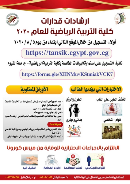 • قيمة الرسوم للملف 450 جنيه تورد بالكلية + 100 جنيه كشف طبي شامل تورد بعد اجتياز الطالب للاختبارات الرياضية.