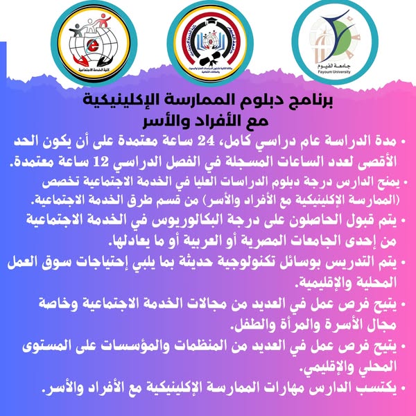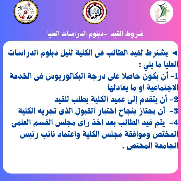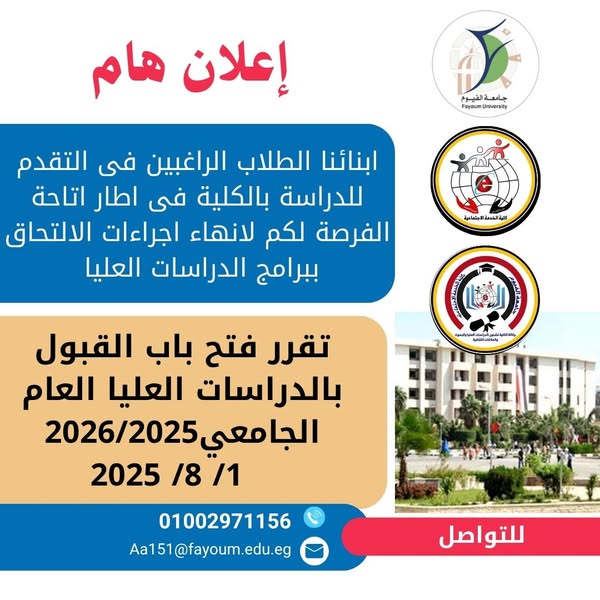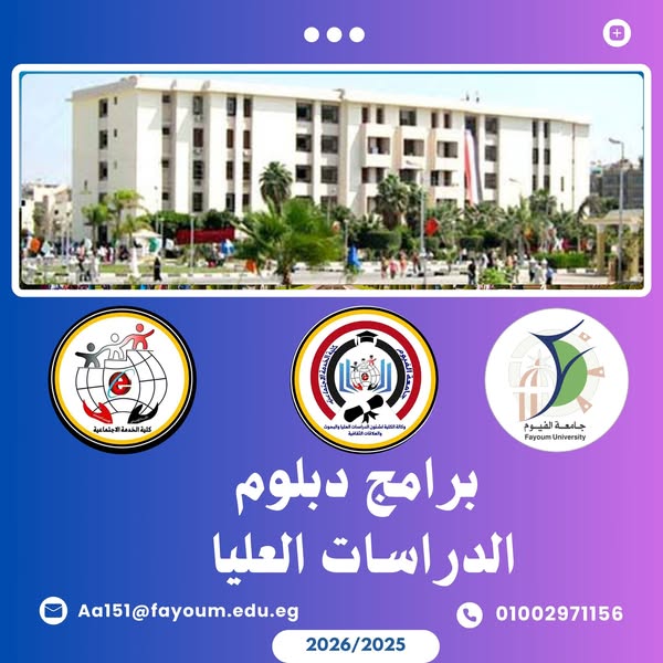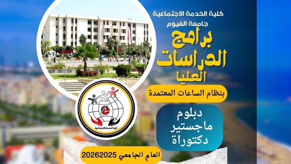 تعلن كلية الخدمة الاجتماعية – جامعة الفيوم عن فتح باب القبول للقيد ببرامج الدراسات العليا للعام الجامعي 2026/2025م اعتباراً من 1/8/2025م